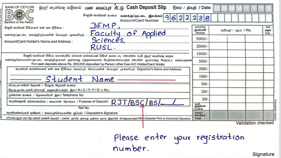 - Payments should be made to the Rajarata University of Sri Lanka at the Bank of Ceylon, Mihintale Branch, Account No. 0009622238. (sample of payment slip is attached)