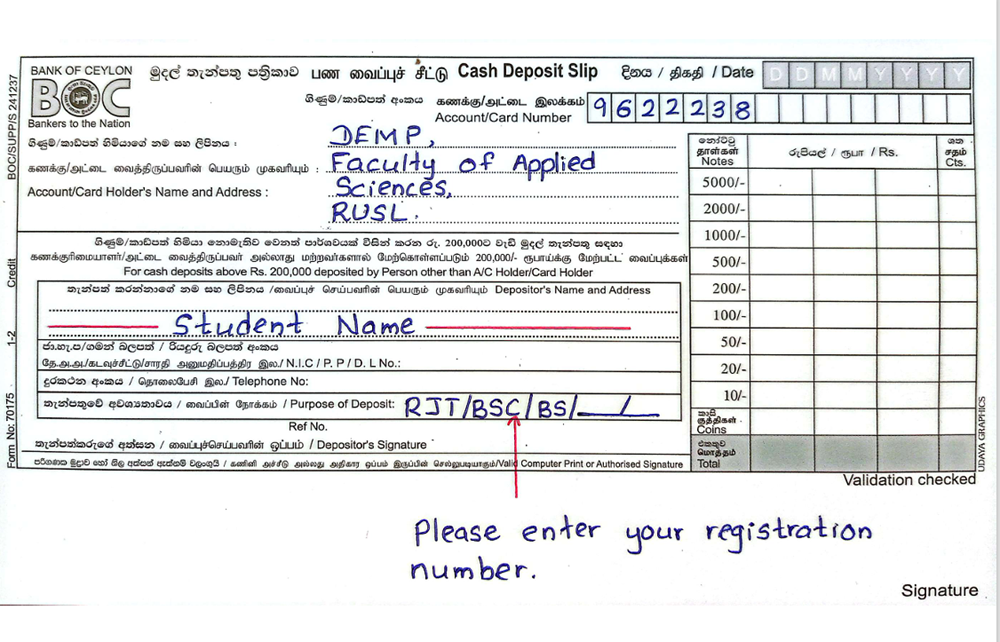 • After making the payment, please send the bank slip via email to bsconline@rjt.ac.lk and by post to the following address: